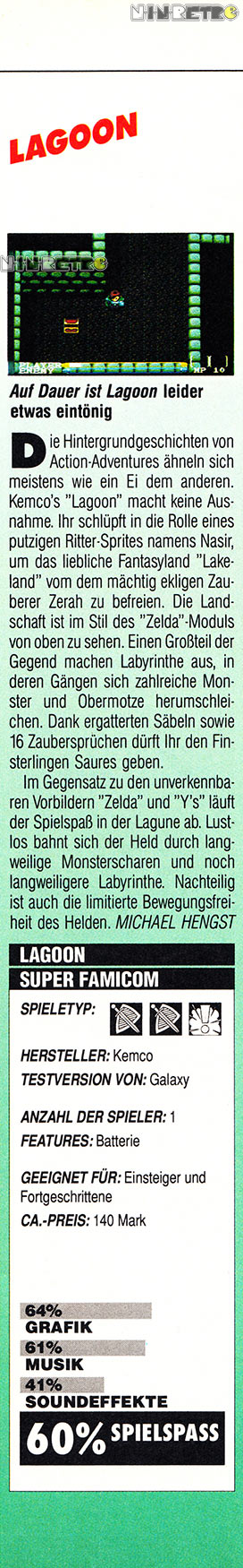 Lakeland has a drinking problem. All the water has been fouled, and it's up to you to find out why. As Nasir, Child of Light, you will embark on a quest that demands great courage and fortitude. It's a journey that takes Nasir from childhood to manhood, played out against breathtaking, 16 bit backdrops. Along the way, you must negotiate a network of labyrinths filled with horrifying, 3-D creatures. Using weapons, magical items and 16 spells, you can turn the tide, defeating the forces of evil and restoring pure water to this once tranquil little town.