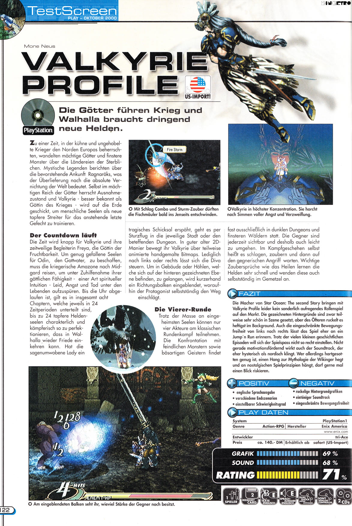 Hab die PSP Fassung mir gegönnt. Nun ein interessantes Spiel Konzept was ich bei Valkyrie Profiles 2 nicht so richtig verstanden hab obwohl das Game grafisch auf der PS2 sehr heraussticht. Die ruckler sind manchmal sehr krass und grad bei Arealübergänge. Grafisch und musikalisch ein sehr interessantes Ding. Spielerisch mit den Dungeons, Rätseln, Kämpfen (vorallem das Kampfsystem)und das Level Up System. Zur Story und dem Storytelling doch für ein grelles, helles und schön buntes in Sprite gezeichnete Figuren, sehr ungewohnt morbide und düster. Ich hab jetzt nach 5 Stunden ein wenig gebraucht um das System zu verstehen und muss selber sagen so bis jetzt kein perfektes Game aber doch eins was aus der PS1 Ära raussticht. Das Kampfsystem selber erinnert etwas an Xenogears nur wirkt es hier weitaus Kombomäßiger wie in einem Prügelspiel fast. Keine abschließende Wertung. Dennoch als PSP Fassung ein Geheimtipp wie ich finde