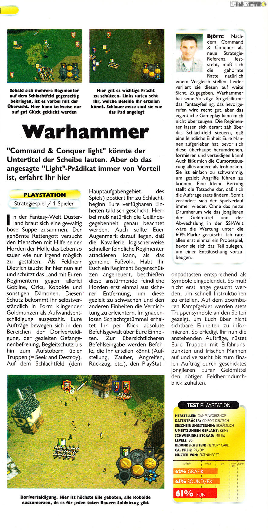 Ein absolut geniales Echtzeit-Strategiespiel auf der Playstation 1. Aber nicht wegen der Technik, sonders der Präsentation, den Ideen und deren Umsetzung. WOW. Das Fantasiereich ist absolut glaubwürdig und geht richtig gut rein. Wenn das Spiel nicht so sackschwer wäre. Warhammer ist auf jeden Fall ein Geheimtip, keine Frage. Aber nur für Strategie-Perfektionisten geeignet. Man braucht ein sehr dickes Fell...denn das bekommt man derart oft über die Ohren gezogen, daß es schon nicht mehr feierlich ist. Aber als Belohnung wartet ein Fantasiehappen, den man bis Heute auf Konsolen suchen muß!