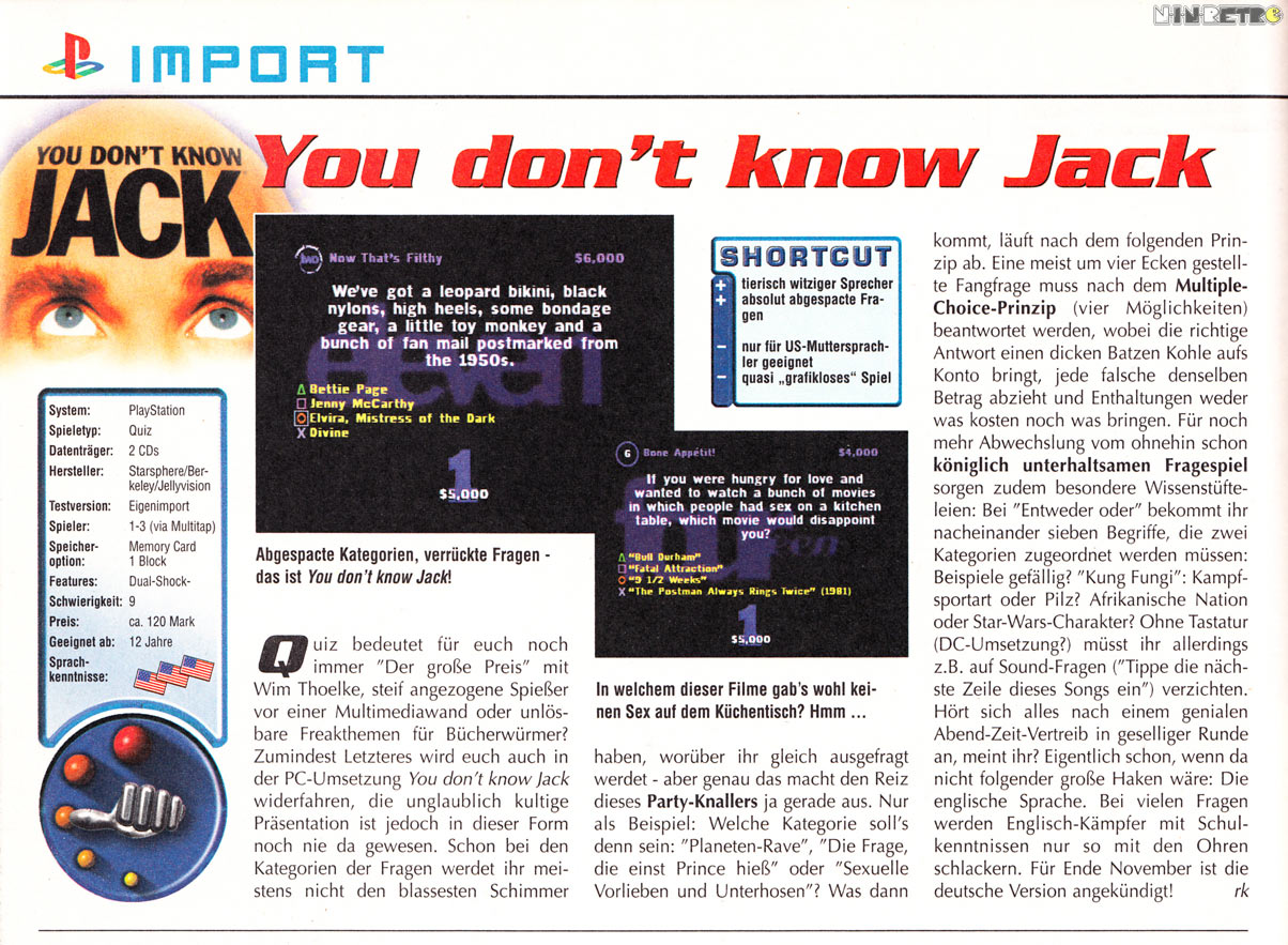 Kann mich auch noch dunkel daran Erinnern. Hab's vor Ewigkeiten mal bei einem Kumpel gespielt und wir haben teilweise vor Lachen auf dem Boden gelegen. War aber auch die deutsche PC-Version, wie im Test beschrieben völlig absurde Fragen mit noch bekloppteren Antworten!