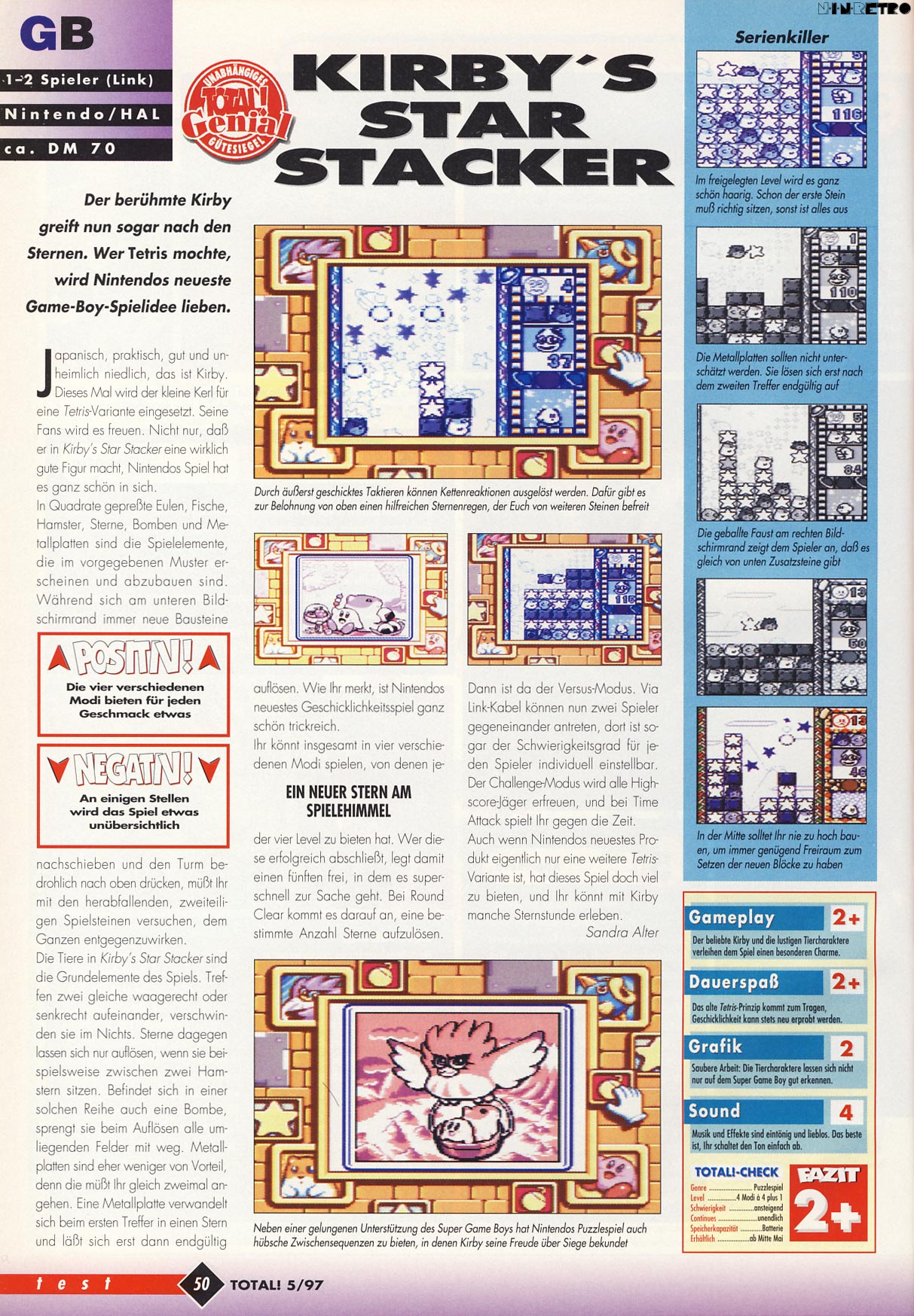 Kirby's Star Stacker features pure puzzle fun for everyone. From above, blocks rain down constantly. From below, whole lines appear with unrelenting clock-like regularity. Simply sandwitch the stars between Kirby's pals and you'll soon be on your way to the high score.