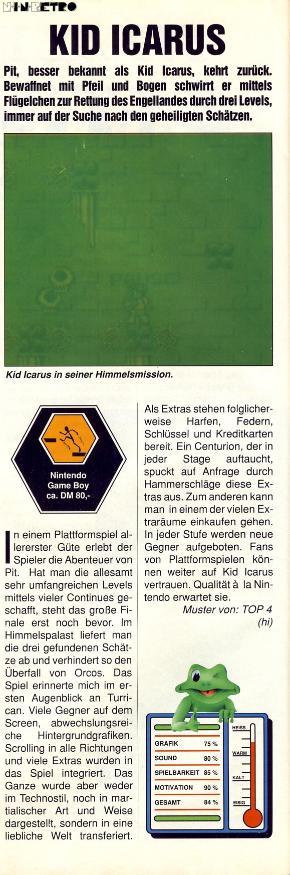 Aufregung im Engel-Land. Mythische Monster treiben ihr Unwesen. Hilf unserem Helden Pit, bekannt als Kid Icarus, die Monster zu vertreiben. Nur mit seinem zuverlässigen Bogen bewaffnet, kämpfst Du gegen die Bösen und findest dabei die Drei Heiligen Schätze, welche die Göttin Palutena versteckt hat. Aber erst wenn Du diese Abenteuer bestanden hast, bist Du stark genug, um den Kampf gegen die Dunklen Kräfte, die Engel-Land bedrohen, aufzuhemen!