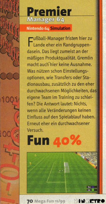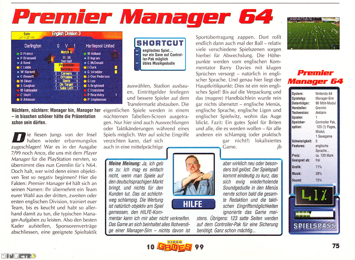 Think you can manage a club better than the professionals? The team, the tactics, the sponsorshhip deals, the finances, the board of directors... Premier Manager 64 gives you everything you need to take on the toughest challenge of all. This is not just a game; this is total football management.