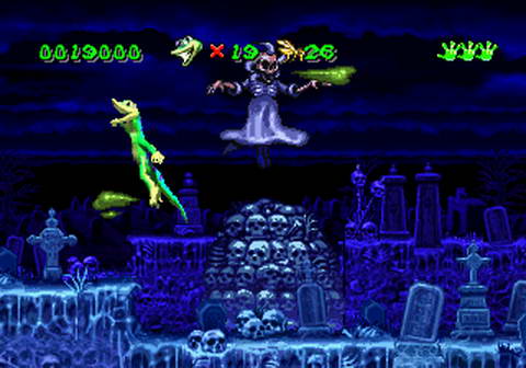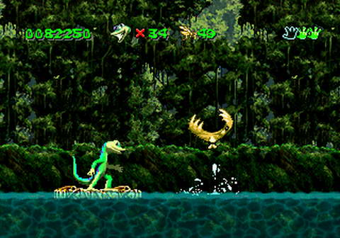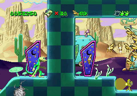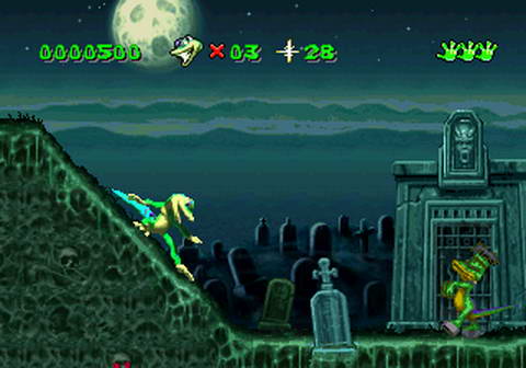 Gex must escape the media dimension by using his thrashing tail and suction cup paws! Over 450 frames of 3D animation and hand-rendered backgrounds!
