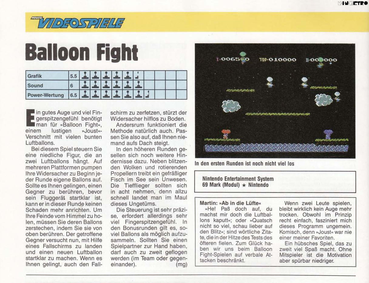 Wenn man die 60 Hz.-Version gewohnt ist und dann das "deutsche" Modul spielt, ist der Unterschied schon ziemlich nervig. Ansonsten: Klasse Spiel, nach ein paar Übungsrunden, um mit der seltsamen Steuerung zurechtzukommen, spielt sich "Balloon Kid" sehr gut.