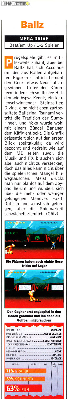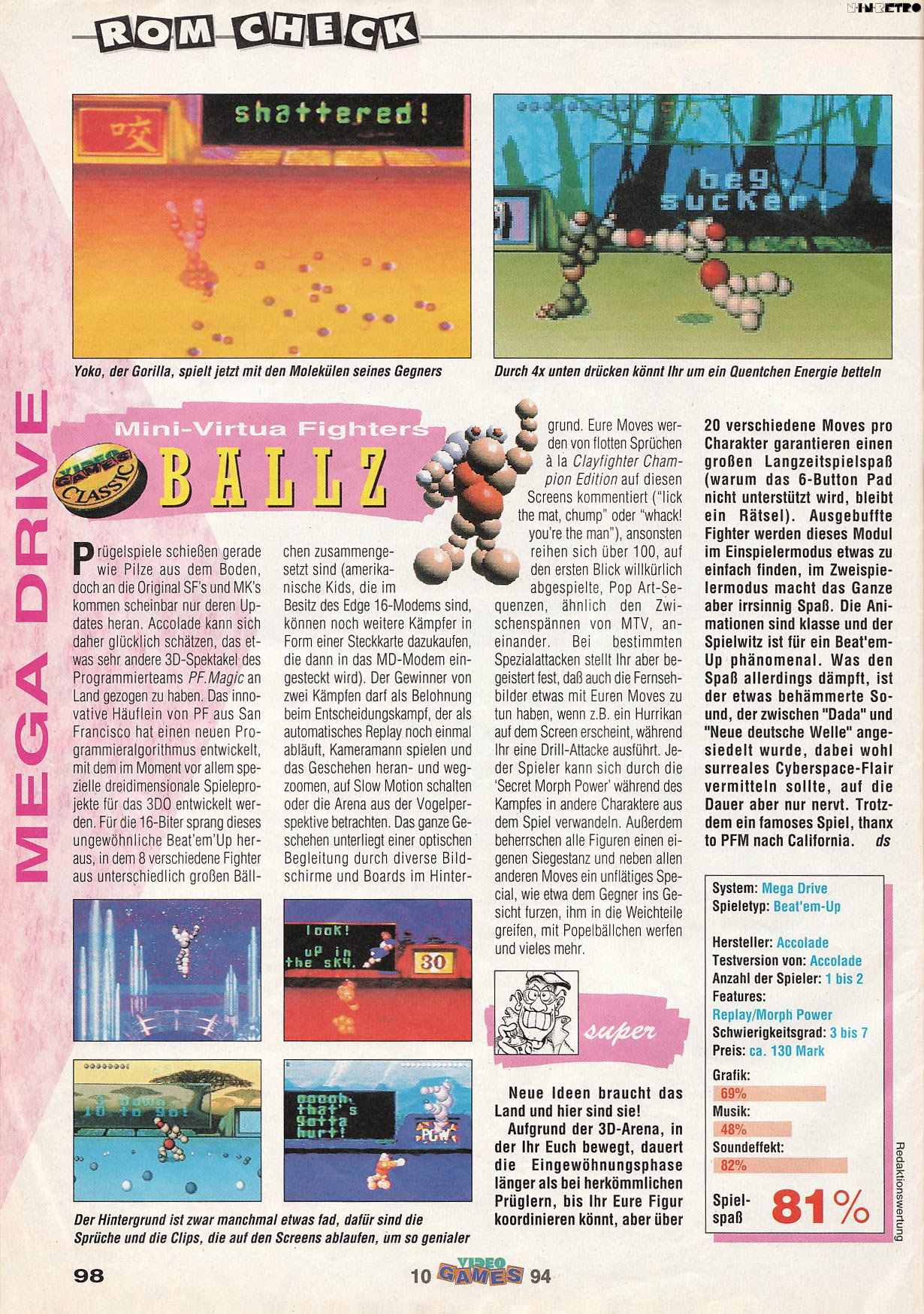 Ballz is a killer 3-D fighting game. It's an in-your-face, all out fight to the finish with 8 unique characters and 8 bosses that punch, kick, club, slam, humiliate and fart on their opponents. Ballz even has an instant replay that shows you the damage from almost any angle. And with three times more special moves than those flat 2-D games, you're going to be doing lots of damage. Our characters will even morph into other characters whenever you want. Ballz also has a bunch of weird sound effects and a wisecracking scoreboard. It's the coolest *#!#@*#! fighting game on the shelf!
