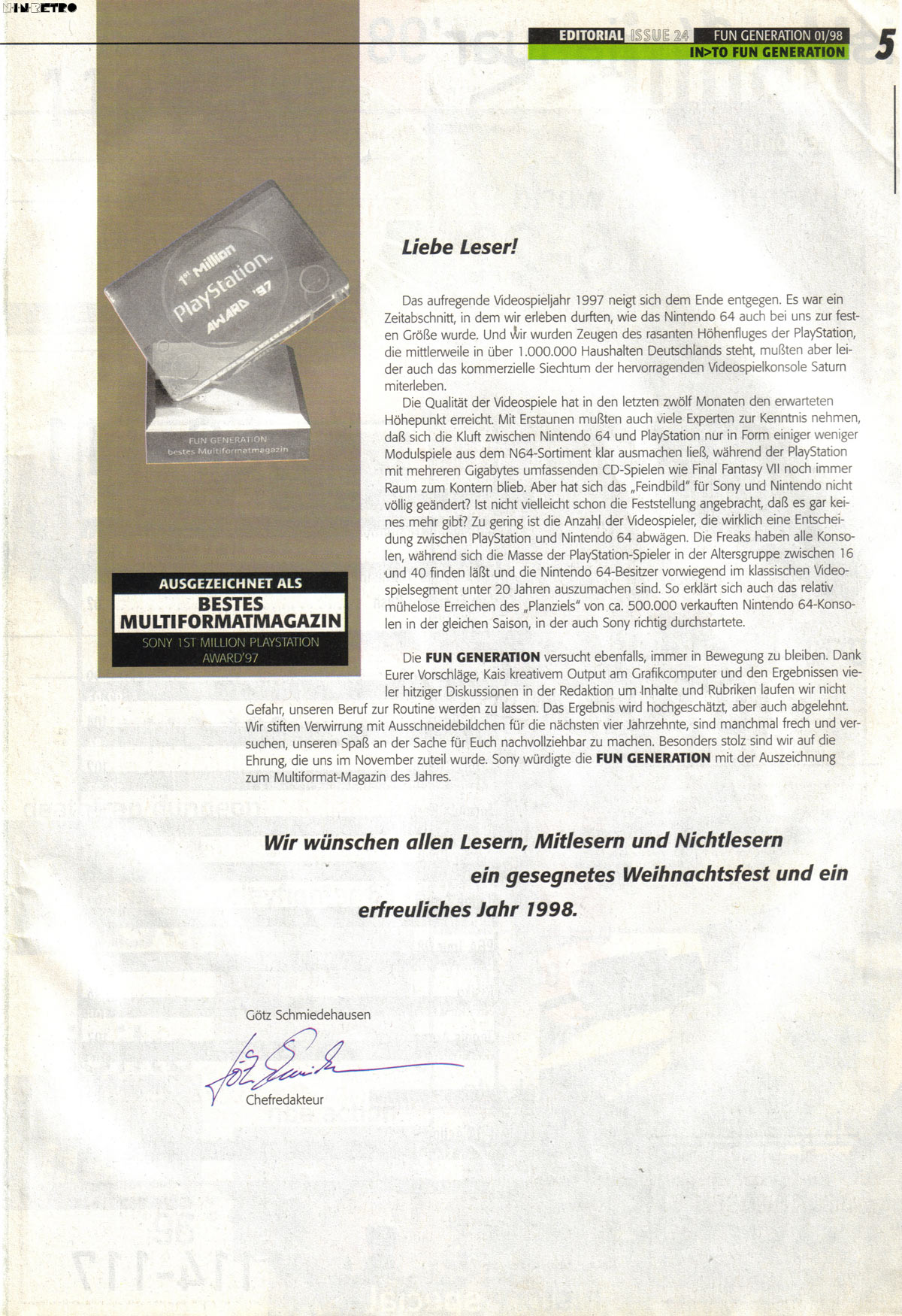Herrliche Zeiten damals! Die Fun Generation gewinnt den Award von Sony und schreibt prompt "PLAYSTATTION" auf's Cover. Tolles Magazin, damals mein Favorit.